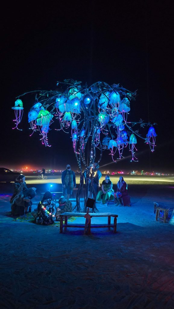 Out in deep playa at night is where it really hits. Art cars moving slowly across the open desert. Bikes lit up in every direction. Massive installations glowing in the distance. It doesn’t feel like a festival — it feels like you’re inside something that shouldn’t exist.
