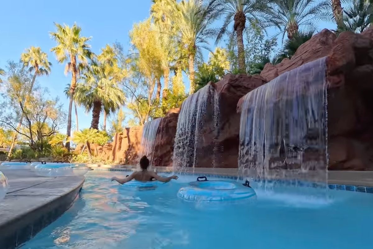 The lazy river wraps through a landscaped tropical-style pool area with palm trees, waterfalls, and that resort soundtrack in the background. It doesn’t feel like Vegas. It feels like you accidentally booked a Caribbean timeshare.